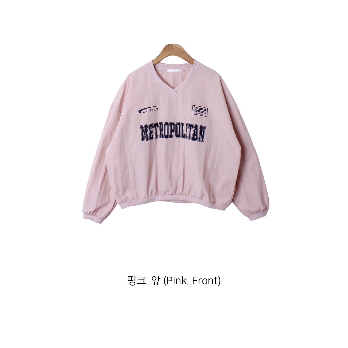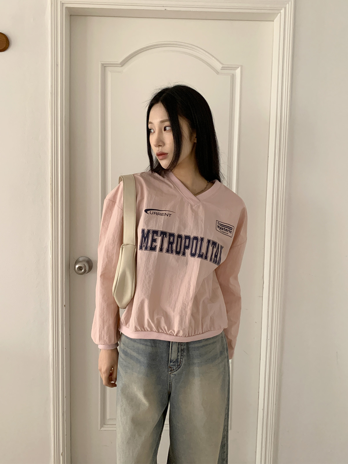 넥라인이 브이넥으로 되어있어 목이 길어보이고, 가슴에 레터링 포인트로 밋밋하지 않으며 나일론 소재로 Y2K무드를 연출할 수 있는 맨투맨
