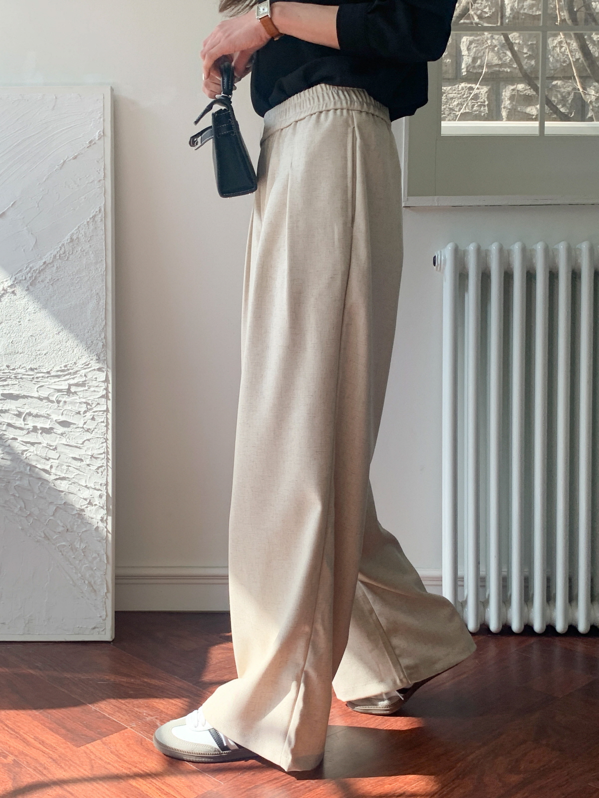 핀턱 디테일 포인트로 세련된 실루엣을 연출해 주는 코튼 와이드 팬츠에요!