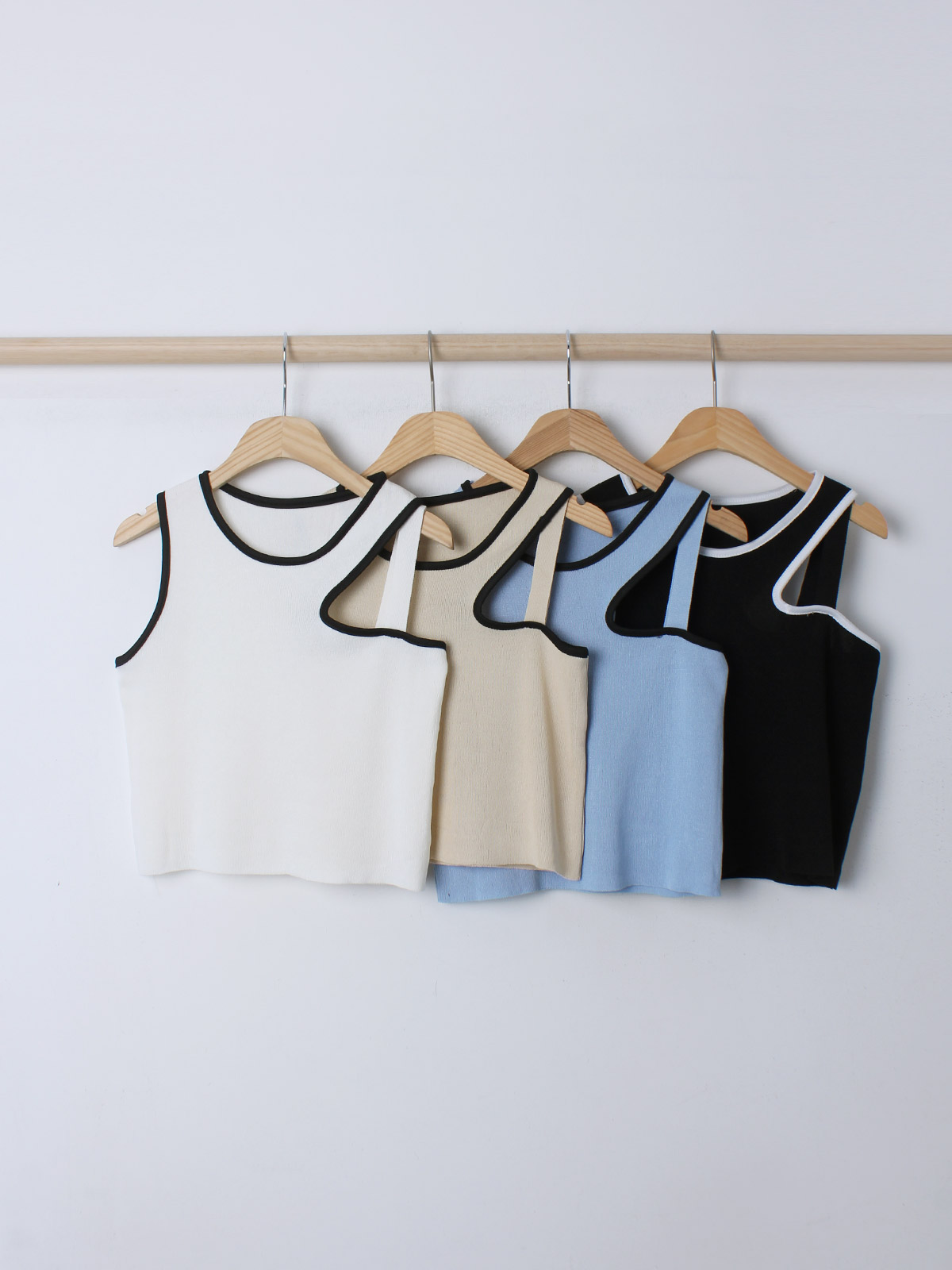 언발 절개 포인트 넥라인이 유니크하며, 배색 포인트가 들어가 페미닌함을 더한 민소매 티셔츠