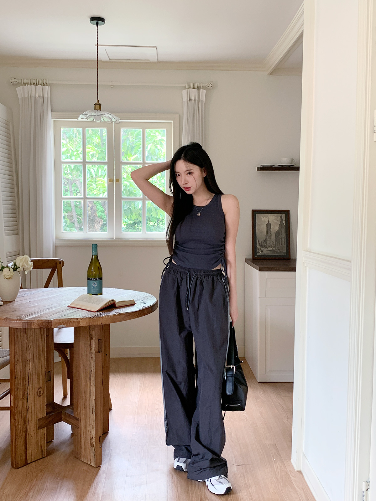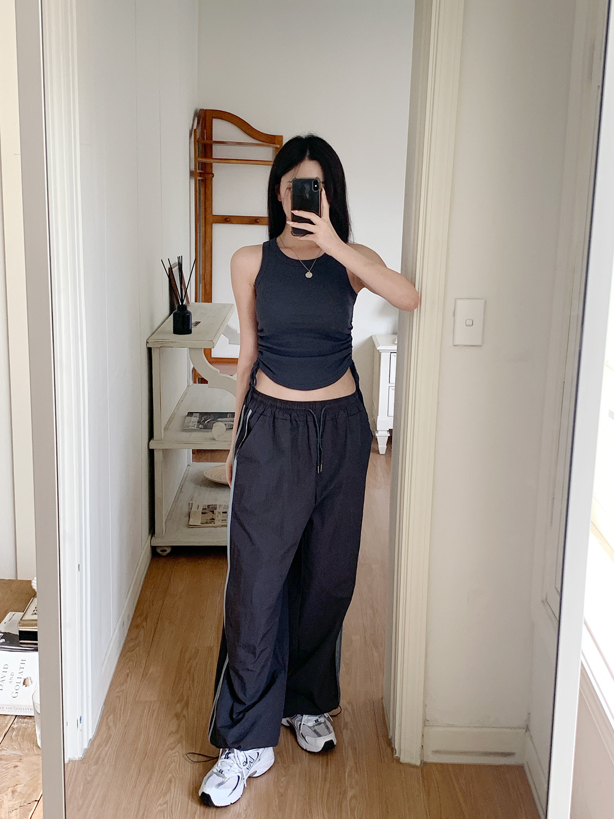 허리밴딩으로 편하게 착용 가능하시고 바스락 거리는 여름 소재로 썸머 시즌에 활용하기 너무 좋은 두줄 트랙 포인트 팬츠